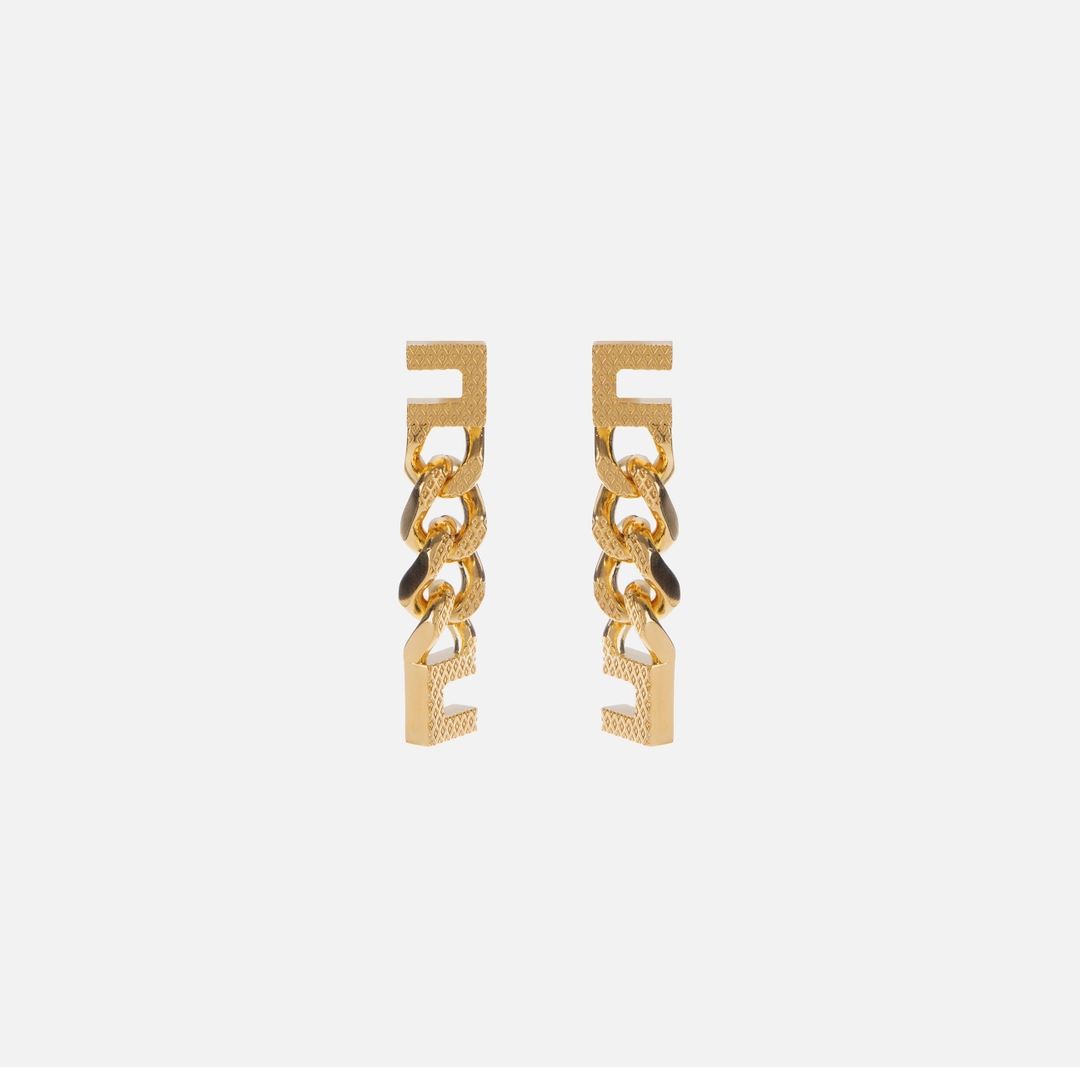 Cercei cu logo din metal auriu cu ac și închizătoare și pandantive lungi din maxi lanț groumette moletat.