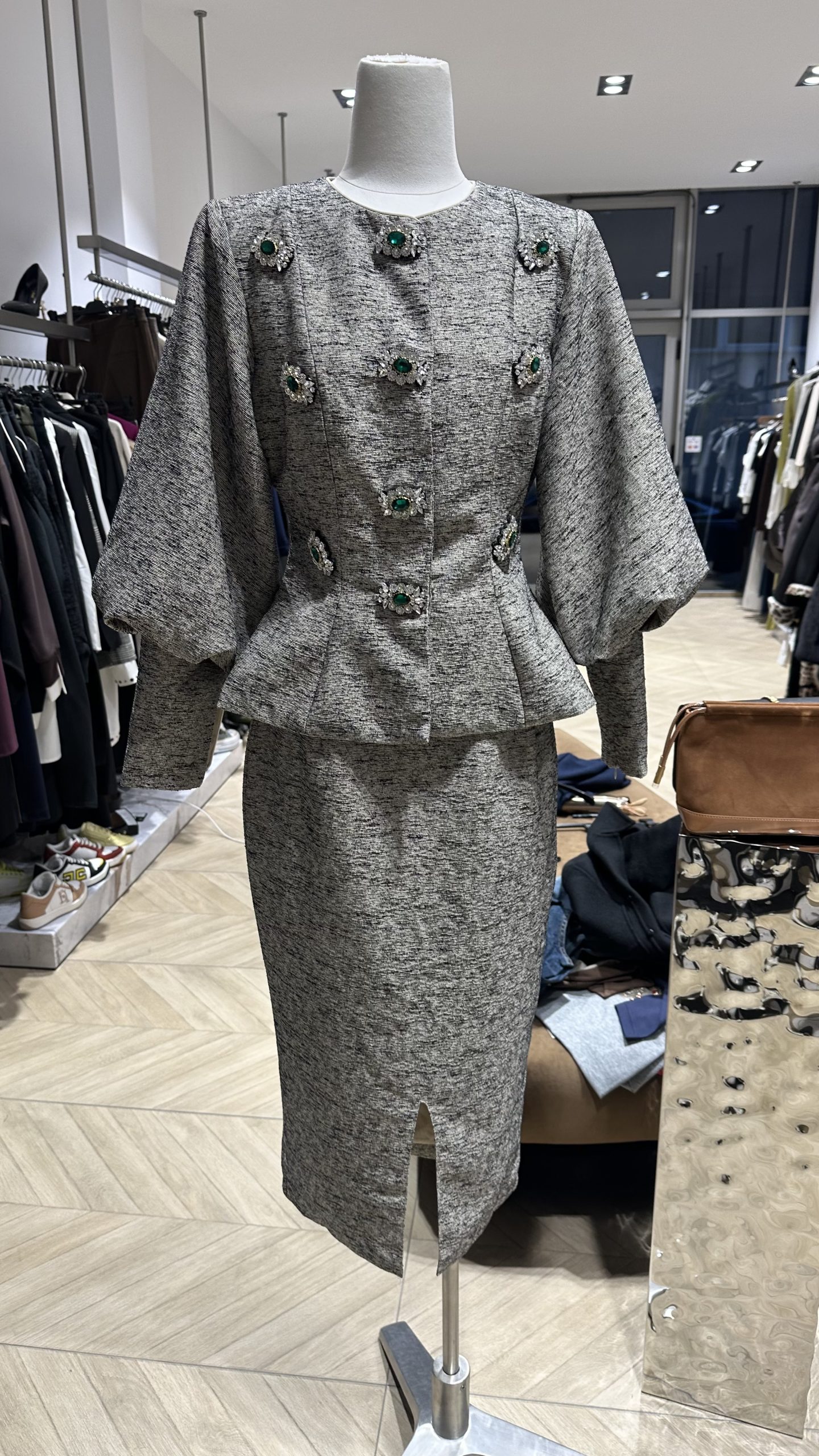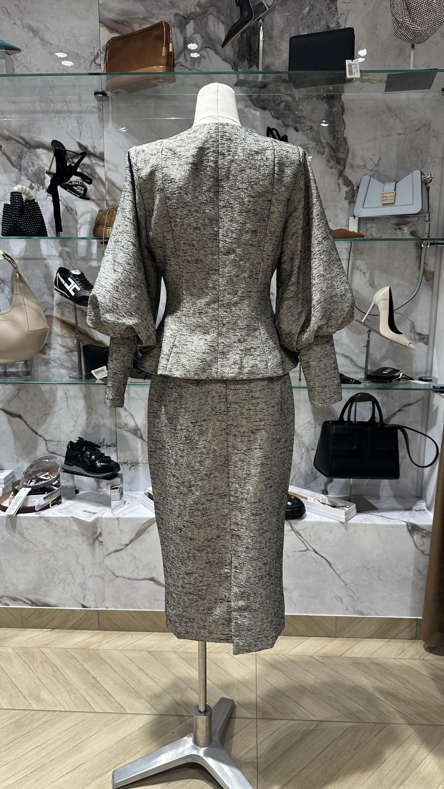 Redefinește eleganța clasică cu acest costum sofisticat de damă în nuanța rafinată de gri, perfect pentru evenimente speciale, întâlniri formale sau ocazii business. Costumul este compus din două piese — o bluză tip sacou și o fustă conică, croite cu atenție pentru a evidenția silueta feminină cu rafinament și discreție.