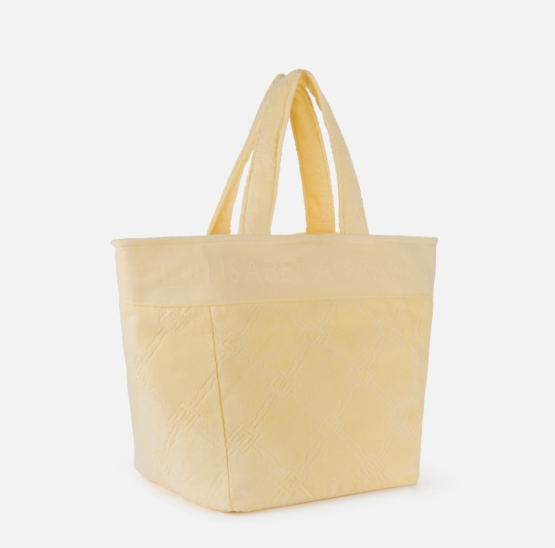 Geantă tote cu mâner din pânză de chenille. Accesoriul este impodobit cu un model jacquard de diamante si un logo contrastant.