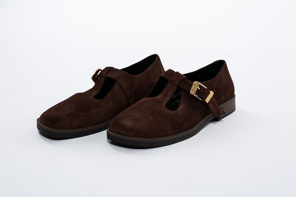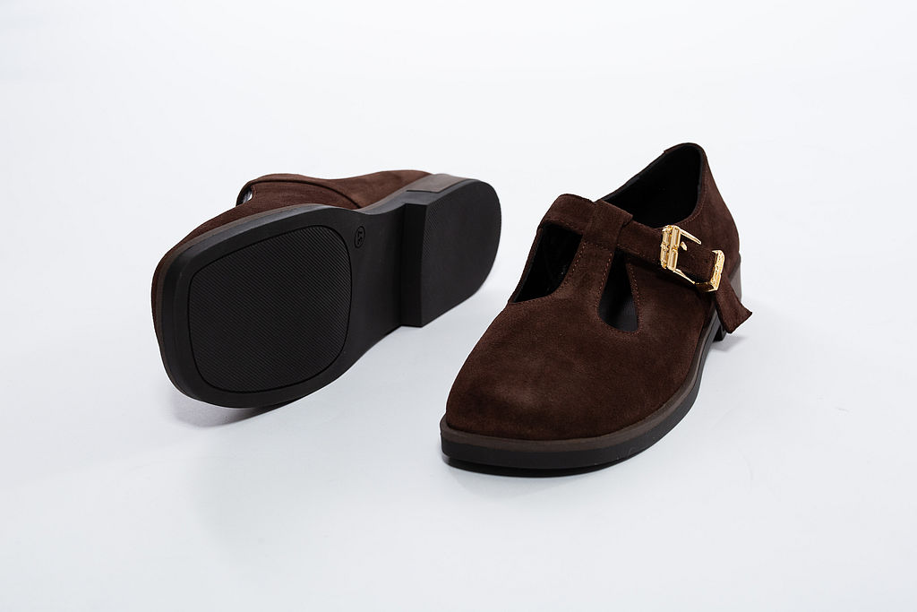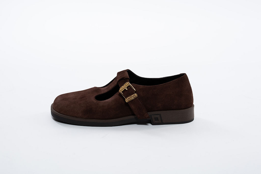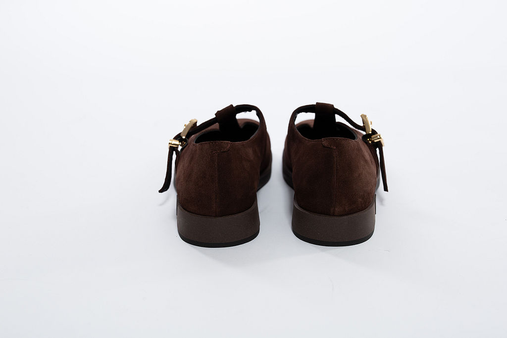Acești pantofi clasici, de culoare maro, confecționați din piele întoarsă de înaltă calitate, aduc un plus de rafinament oricărei ținute. Designul lor atemporal, inspirat de modelul Mary Jane, este completat de o baretă lată pe gleznă, prevăzută cu o cataramă metalică aurie ce adaugă o notă distinctivă și elegantă.