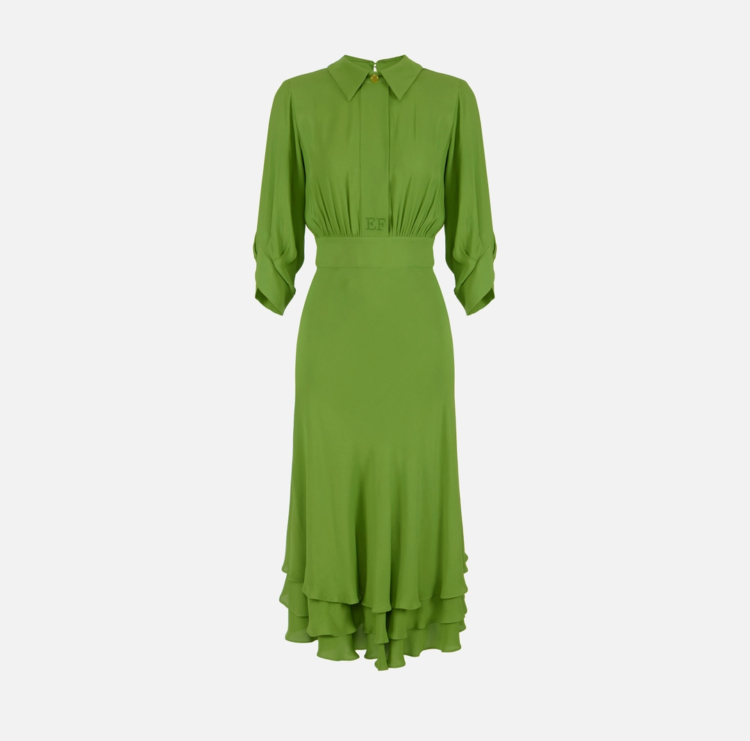 Rochie din georgette de vâscoză, cu croială regular. Are mâneci trei sferturi cu manșete în formă de migdală și fustă cu volane în partea de jos, care adaugă fluiditate și mișcare. Piesa prezintă o deschidere la spate și o curea tip sash, care se leagă în talie. Un logo brodat pe fentă completează designul cu un detaliu elegant.