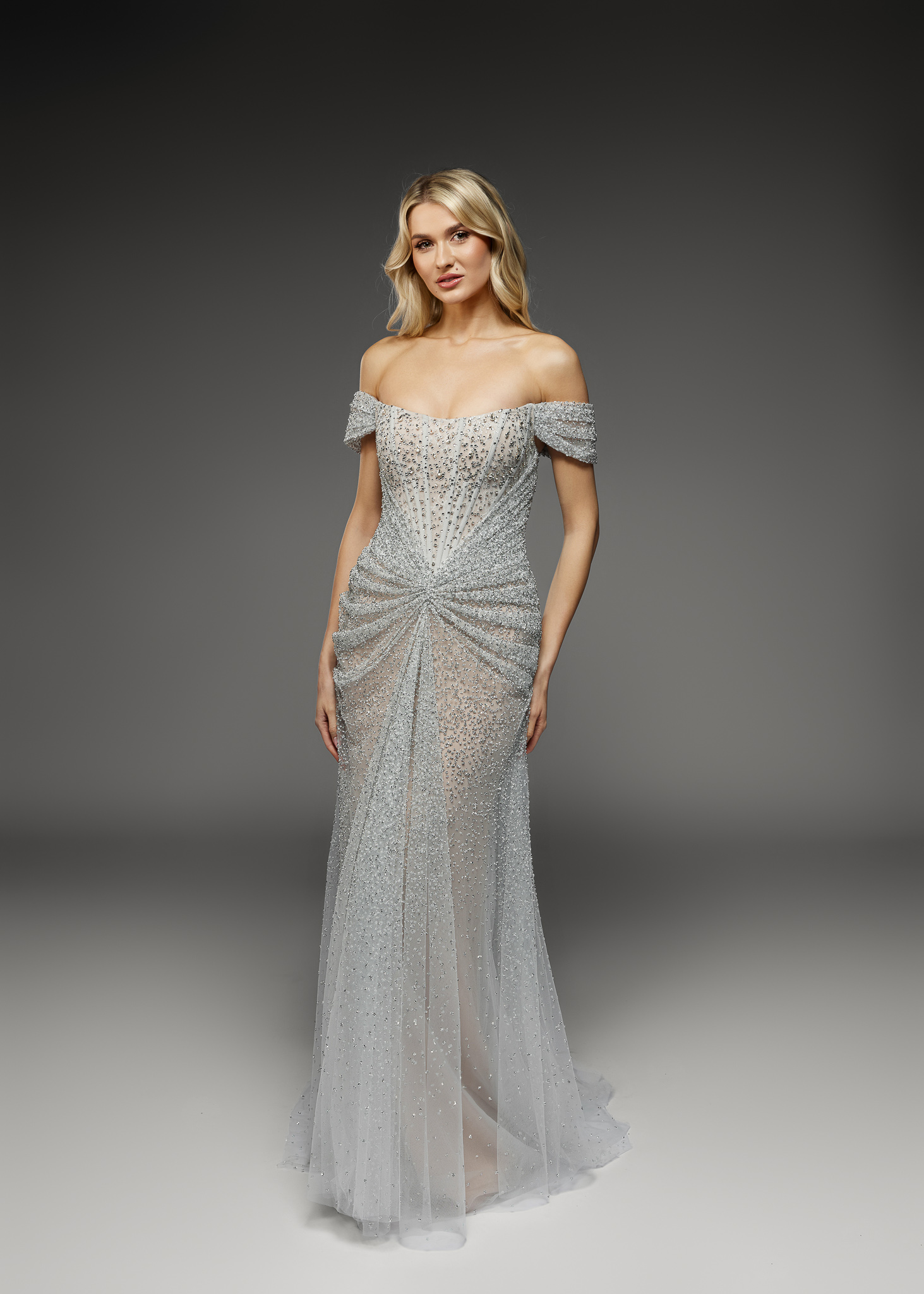 Rochie lungă într-o nuanță rafinată de argintiu, realizată din tull fin cu aplicații delicate ce oferă un efect strălucitor subtil. Decolteul amplu și mânecile căzute pe umeri evidențiază elegant linia bustului, iar drapajul din talie conturează armonios silueta. Designul fluid și detaliile prețioase transformă această rochie într-o alegere ideală pentru evenimente speciale, recepții sau seri de gală.