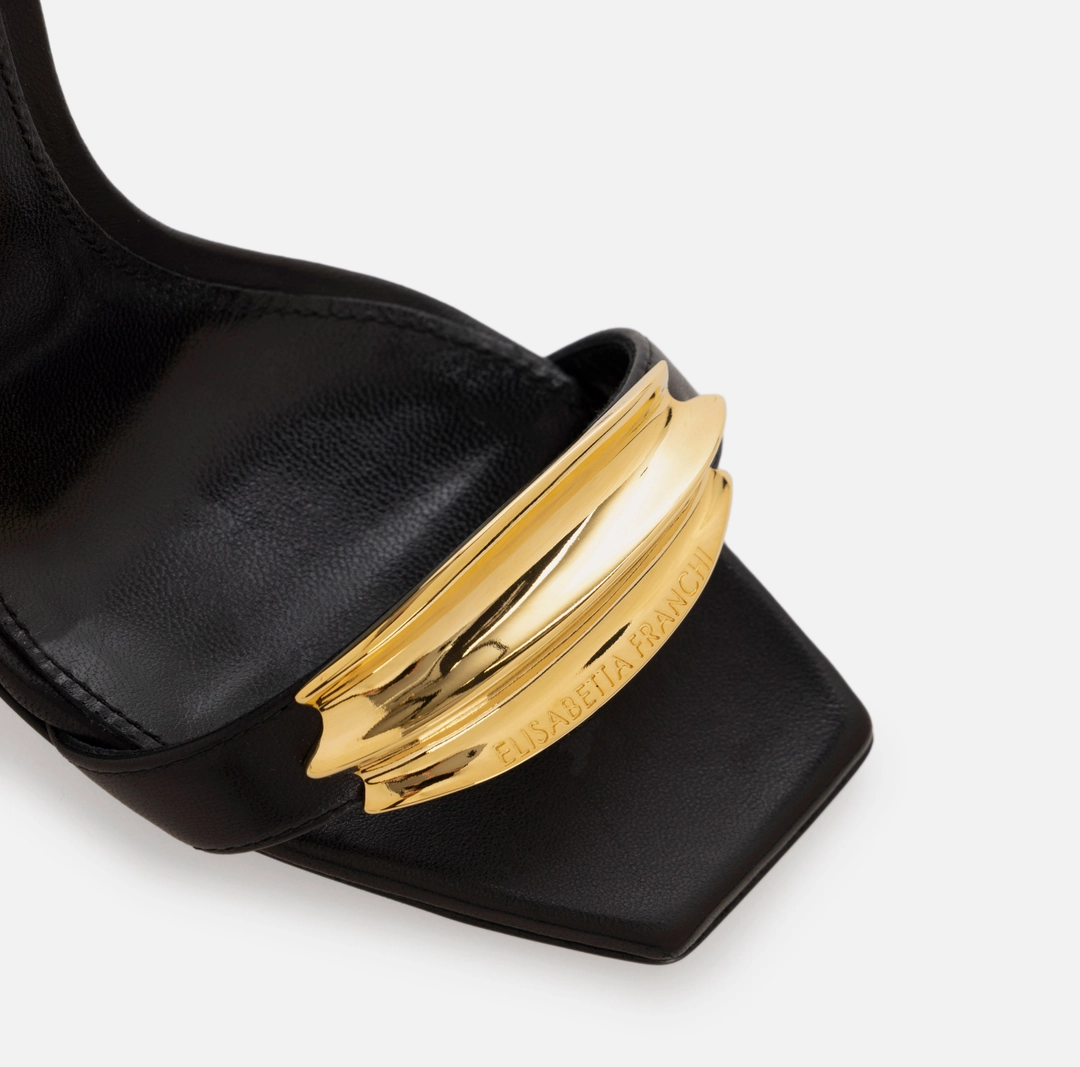 Sandale din piele cu toc stiletto. Se remarcă prin detaliul de bijuterie din față cu un efect texturat care amintește de o frunză. Inchidere cu curea la glezna.