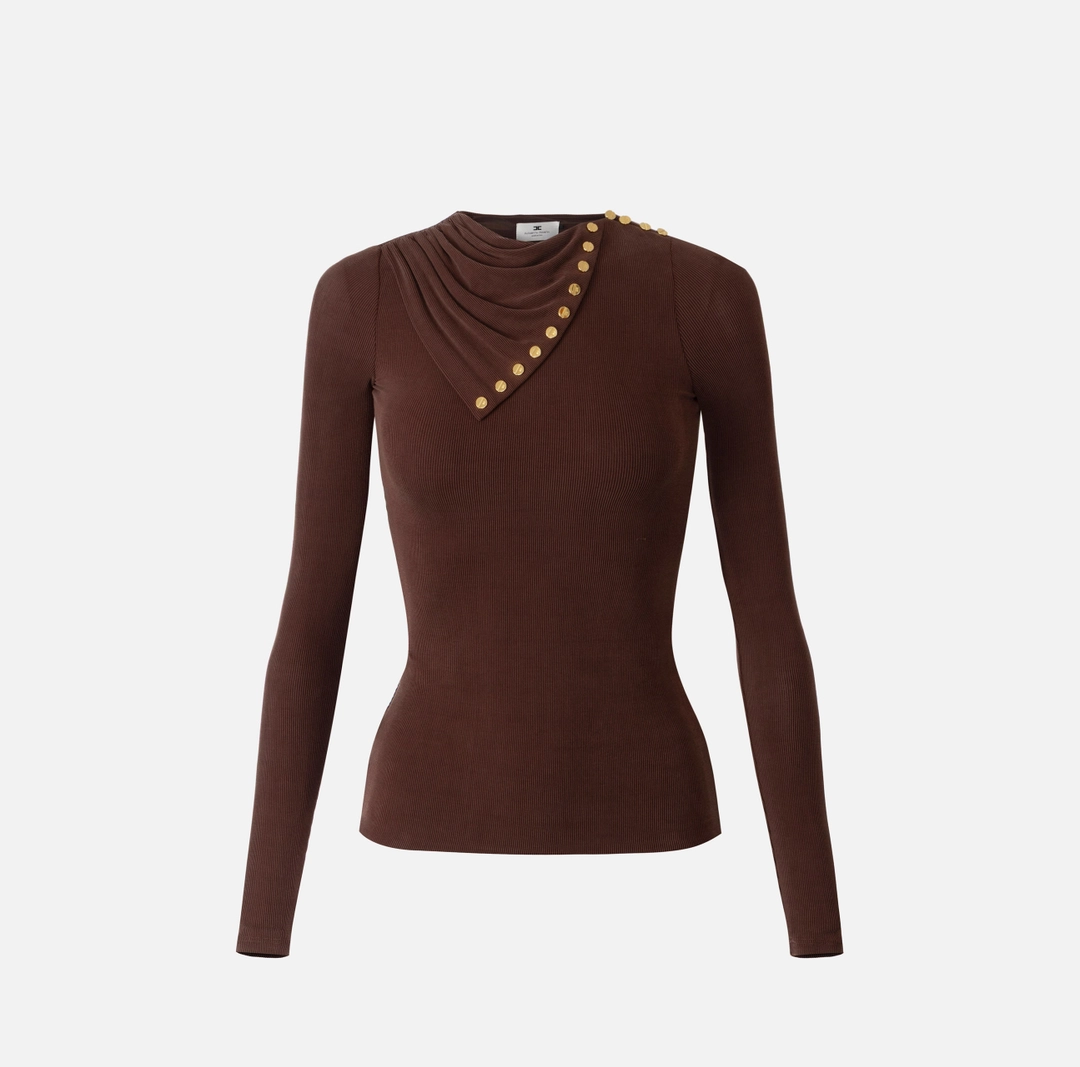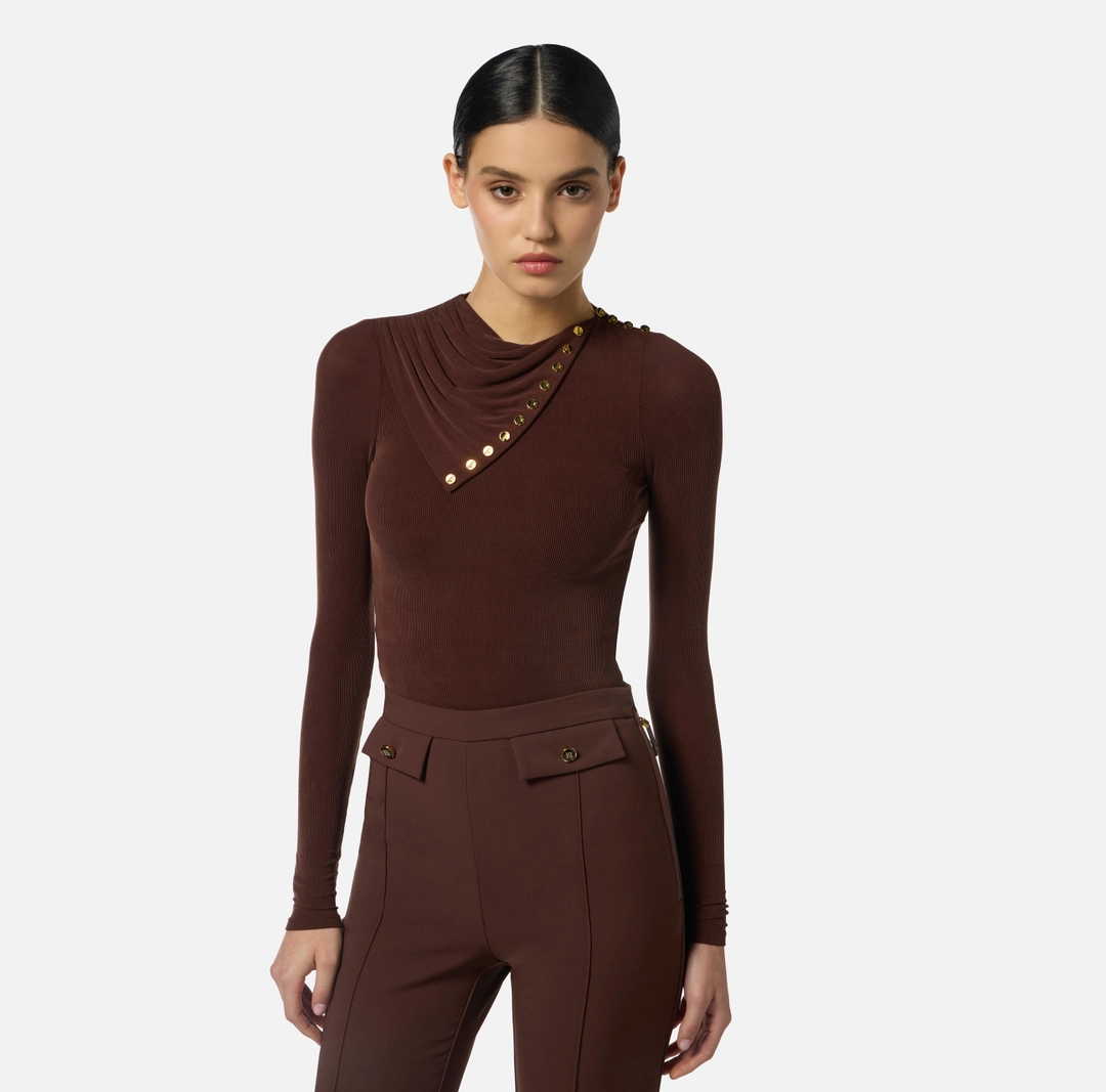 Top din cupro cu o croială subțire (slim fit). Are un guler cu revere drapate, împodobit cu nasturi metalici aurii peste un umăr. O decupaj (cut-out) dezvăluie spatele gol. Tricotajul rebrădat îi conferă o textură bine definită.